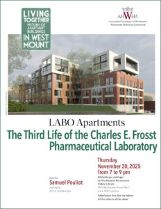 LABO Apartments: The Third Life of the Charles E. Frosst Pharmaceutical Laboratory” with speaker Samuel Pouliot, architect, NEUF architect(e)s, on Thursday November 20 from 7pm to 9pm at the Westmount Public Library.